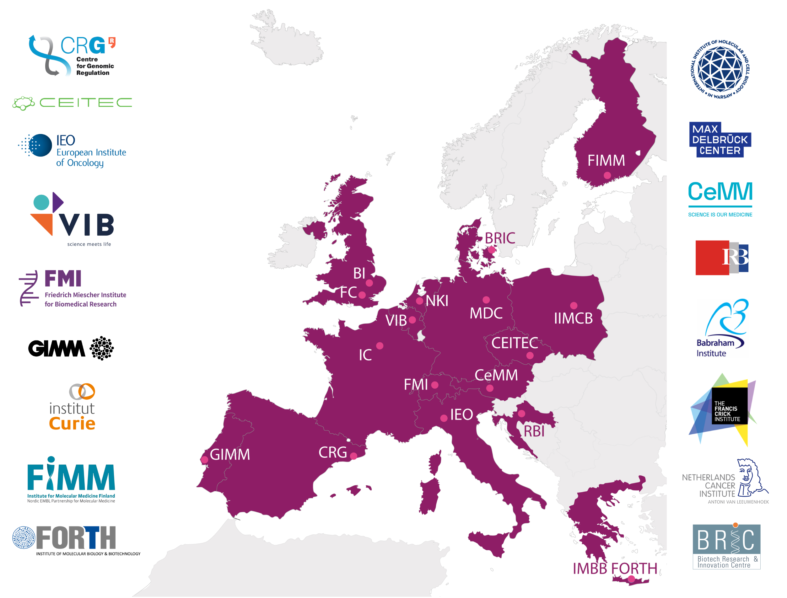 Centre for Genomic Regulation (CRG, Spain) | Central European Institute of Technology (CEITEC, Czech Republic) | European Institute of Oncology (IEO, Italy) I | Flanders Institute For Biotechnology (VIB, Belgium) | Friedrich Miescher Institute for Biomedical Research (FMI, Switzerland) | Gulbenkian Institute for Molecular Medicine (GIMM, Portugal) | Institut Curie (Curie, France) | Institute for Molecular Medicine Finland (FIMM, Finland) | Institute of Molecular Biology & Biotechnology (IMBB FORTH, Greece) | International Institute of Molecular and Cell Biology in Warsaw (IIMCB, Poland) | Max Delbrück Center (MDC, Germany) | Research Center for Molecular Medicine of the Austrian Academy of Sciences (CeMM, Austria) | Ruđer Bošković Institute (RBI, Croatia) | The Babraham Institute (Babraham, United Kingdom) | The Francis Crick Institute (Crick, United Kingdom) | The Netherlands Cancer Institute (NKI, The Netherlands) | The University of Copenhagen Biotech Research & Innovation Centre (BRIC, Denmark)
